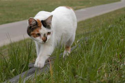 もともと少し離れた場所にいる猫だが食事のときだけチャッコの目を気にしながら通ってくる。 |