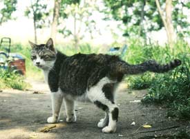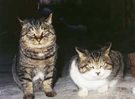 チッコ(♀・12歳)の子、ドンとゴン。当時は他の先住猫との折り合いが悪く、700m上流に6年間食事を運び続けた。03年11月チッコも含めて他の猫が風邪で死亡したため、この場所に連れてきた。
