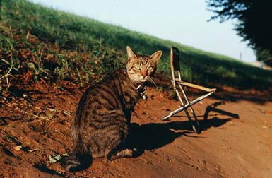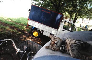 | サクラは残念ながら私の予想どおり2日後に息絶えてしまった。Mさんはサクラを土に埋め、その上に石を置きお墓を作ったが、その後に私とMさんはサクラの話をした事はなかった。トラジロウはいつも元気良く、子猫らしいヤンチャな動きで私や周囲の人達のアイドルとなり、皆にかわいがられていた。そんなある日、Mさんが「車が手に入れば犬と猫を連れて日本全国を旅したい、好きな土地で足をとめ車の中で寝泊りすればいいし。」と嬉しそうに話したが、私は話し半分で聞いていた。 | ||||