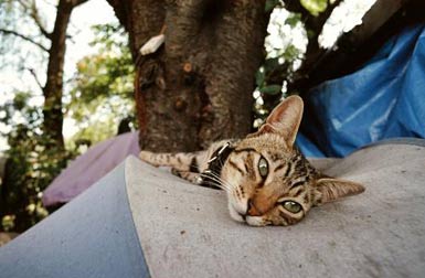 | 多摩川最南端に住むホームレスのMさんのもとにトラジロウの兄弟がやって来た ! というよりも生後3カ月の兄弟猫が何者かによって、Mさんのそばに捨てられた。2匹は充分に人馴れしていて愛くるしいまでに甘え、可愛そうなのでMさんはこの2匹を飼うことに決めた。 一方にトラジロウ(♂)と名付け、もう1匹はサクラ(♀)と命名。トラジロウは子猫らしく活発に愛嬌をふりまくものの、サクラは鼻気菅炎が進行し、目ヤニや鼻水で全身が濡れていて熱もあり食欲もない。私が「治療をしましょうか ?」と声をかけると「いやダメだ、すぐに病院に連れて行ったりしないで、このままで抵抗力をつけさせないとダメになる。」とかたくなに拒否をする。さらに、「こうやって放っておくと動物は自然に抵抗力が付き強くなれる。」と確信をもっているかのような言葉が印象的だった。私は複雑な気分になったまま帰宅した。 |