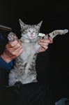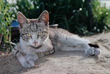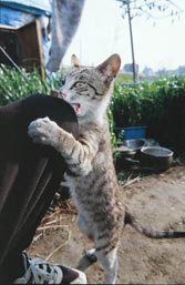 オヤビンは遊び盛り、立ち寄る人に遊びを要求したり、人の肩に突然よじ登ったりと「食う・寝る・遊ぶ」を満喫。まさに我がまま「親分」だった。Fさんは約1年前まで「アカ」という名の猫を飼っていたことがある。アカは悲惨な死を遂げた猫だったので「かわいそうだから、もう猫は飼わない。」と言ってはいたが、困った顔をしているオヤビンに出会って気持ちが変わったのだろう。オヤビンのことを心底かわいがっていた。拾い集めてきた魚や揚げ物に火をとおしものに残飯を混ぜたものを毎日少しずつ食べる、1人と1匹のいつもの食事だった。