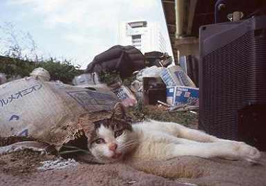 02年の春、河川敷の橋の下に子育て中の母親猫が2匹の子猫と共に捨てられた。橋ゲタに小屋を構えていたホームレスの男性は怯えてお腹をすかせた親子猫をとても気の毒に思い、手にしていた僅かばかりの食パンを与えたのが始まりだった。男性は母猫を「シロ」と 呼び、生まれつき全盲だった子に「ミエコ(♀)」、左目の不自由な子には「クロ」と名付けた。ミエコという名には「目が見えるように」という願いが込められている。 初老の男性( Tさん)は細かなことは気にしない楽天的かつ頑固な性格で話し好きな方でもあった。シロ達の食べ物は近隣の弁当屋さんがカンパしてくれる惣菜などで賄われていた。特にミエコは全盲だったために周囲のホームレス仲間からもそれとなく気にかけて見守られていた。