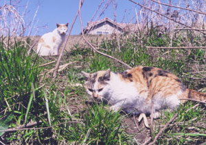 以前は他の猫や野生化したウコッケイと同居していたが、現在は孤立して草むらに潜んでいる。
