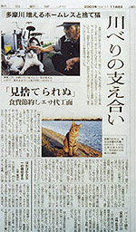 03年11月8日付朝日新聞・夕刊(関東版)に「川べりの支え合い」と題して、ホームレスと捨て猫に関する写真と記事が掲載されました。